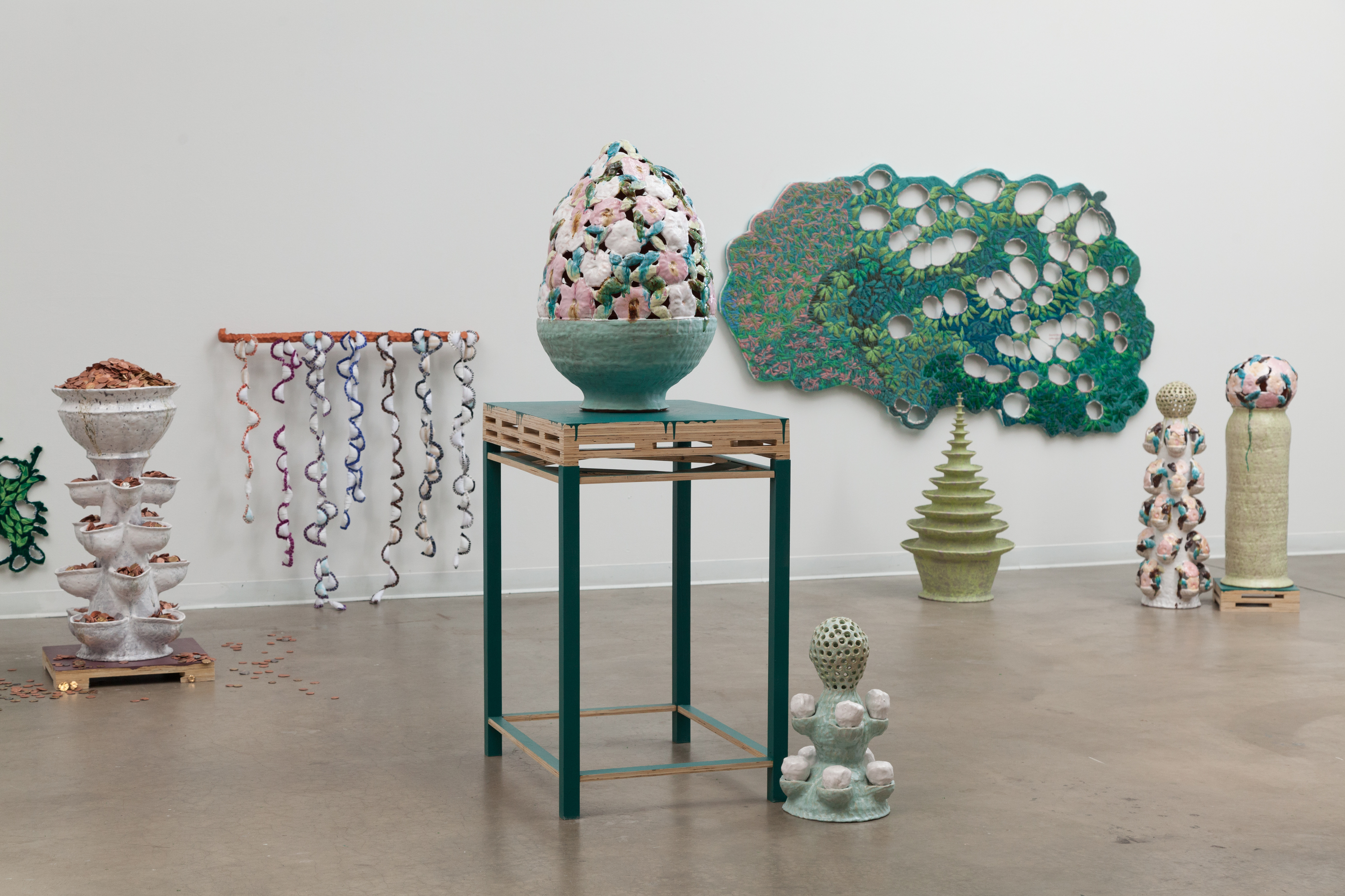 earthenware, glaze, terra sigilatta, hand pinched terra cotta coins, spray paint, luster, muslin, yarn, plywood, poplar, family heirloom fabric, batting