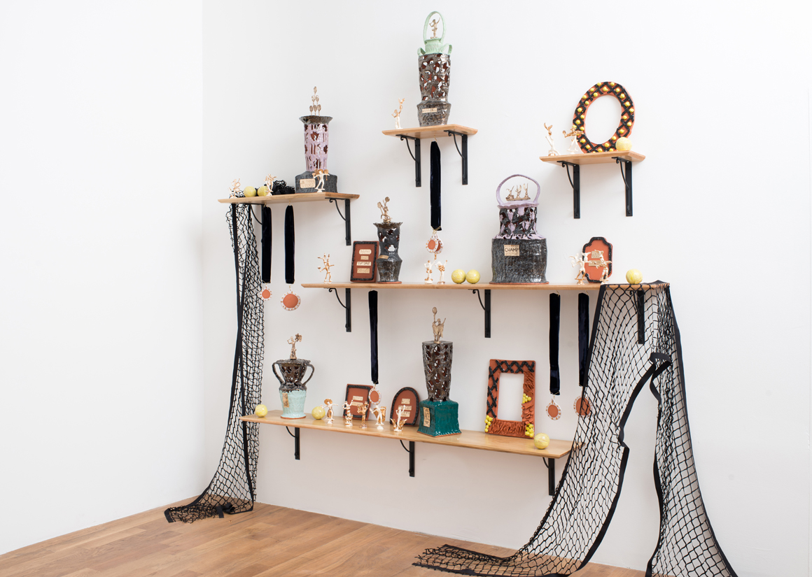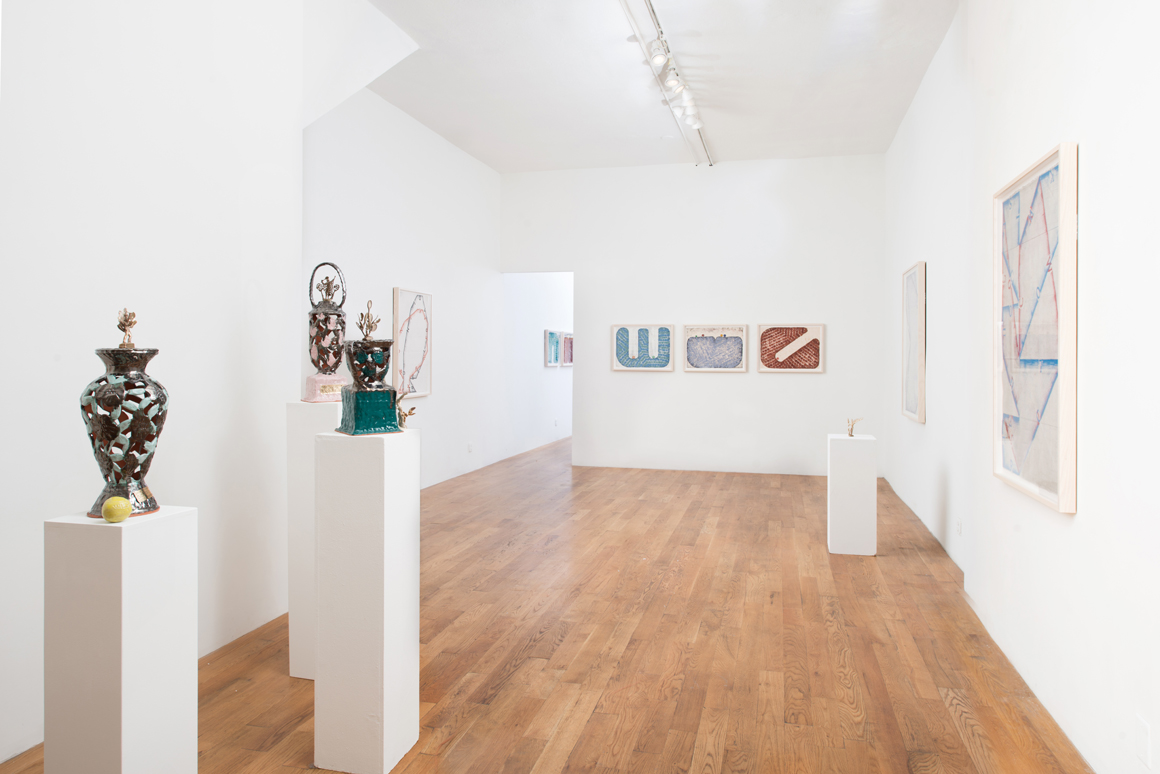 earthenware, glaze, cast bronze, cnc brass, patina, laser cut polyster, blue velvet, poplar